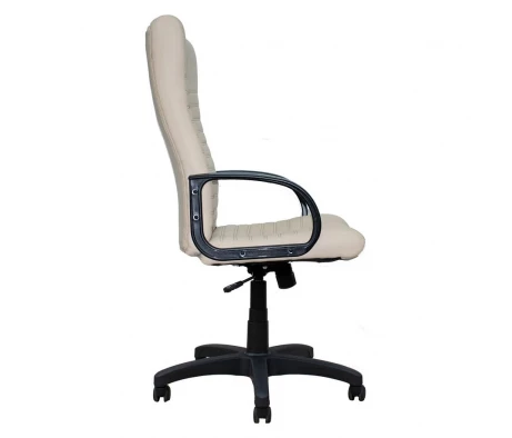 Кресло расположено на полиамидной основе, имеет прочные пластиковые подлокотники и встроенный подголовник из материала экокожа. Имеющийся механизм качания для удобства оснащен фиксатором угла наклона в любом положении, также сидение довольно глубокое, а по вертикали можно регулировать подъем или опускание механизма, что создает дополнительный комфорт в работе.